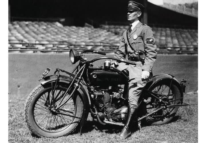 Patrolman Brad Donahue in 1923 with his Indian motorcycle.