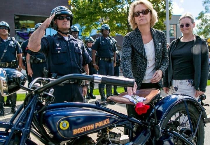 Donna Lovemu, the granddaughter of Patrolman William Abbot, places a rose onto the silent motorcycle. Abbot was killed in the line of duty on Nov. 28, 1931.