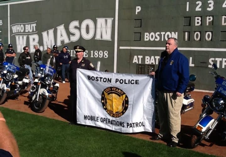 Boston celebrated two centennials in 2012—the building of Fenway Park for the Boston Red Sox and the founding of the Boston Police Department's motor unit, which is known as the Mobile Operations Patrol (MOP) unit. The two centennials came together on Sept. 16, when agency brass recognized the unit's heritage during a ceremony in front of Fenway's "green monster" wall in left field. Photos courtesy of Robert Anthony.
