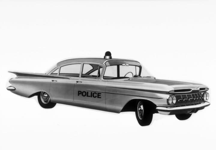 The four-door 1959 Chevy Biscayne offered highway patrol agencies a powerful pursuit vehicle that could reach speeds of 135 mph. Motor Trend warned civilains, "don't play games" with a vehicle it compared to a Ferarro 250 GT in a 1958 article. Photo courtesy of General Motors.
