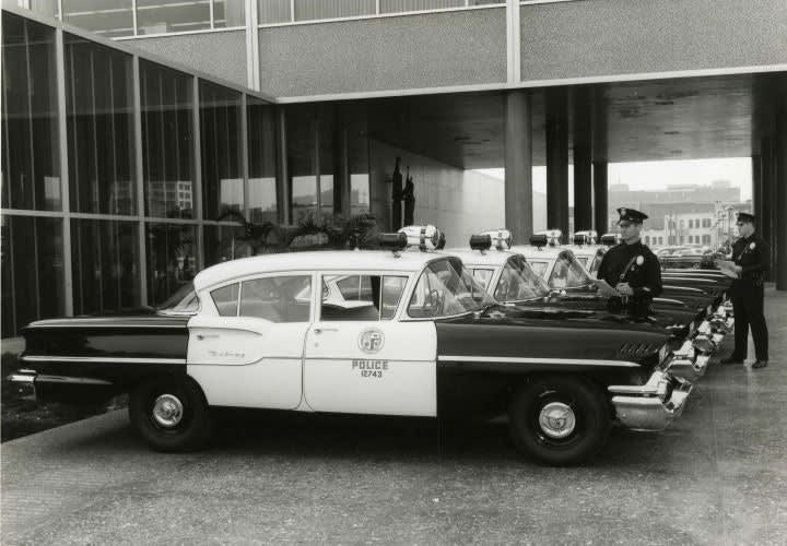 The Los Angeles Police Department used the 1958 Chevy Delray patrol cars, which are lined up outside of Parker Center in this photo. In that year, the Delray was Chevrolet's price-leading, no-frills model, with the more expensive models being the Impala, Bel Air and Biscayne. The low-priced Delray had limited options, minimal interior and exterior trim and was popular with police fleet buyers. Photo courtesy of the Los Angeles Police Historical Society.