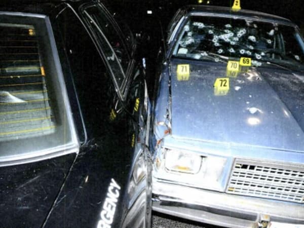 This crime scene photo viewed from the north shows where the Malibu collided with a police unit blocking the suspects' exit route.