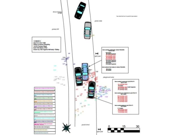 This diagram shows a closer view of the shooting scene, including the location of the multitude of police shell casings.