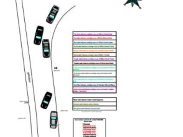 This diagram shows the positioning of the police units and the suspect's 1979 Chevrolet Malibu.