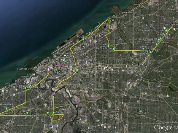A Google Maps image shows the route of the 20-minute pursuit that began at the Cleveland Justice Center (to the left) and ended at an East Cleveland middle school (to the right).