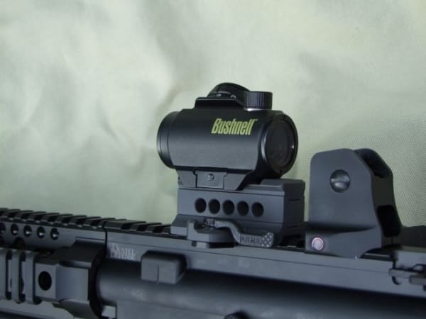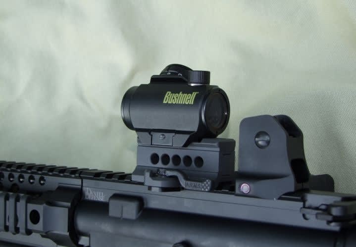 Bushnell's TRS-25 1X atop an A.R.M.S. mount makes for a fast, accurate, and easily removed setup. The TRS-25 is dry-nitrogen filled and features multi-coated optics, an amber-bright high contrast lens coating, 100 percent waterproof/fogproof/shockproof construction, and a CR2032 battery.