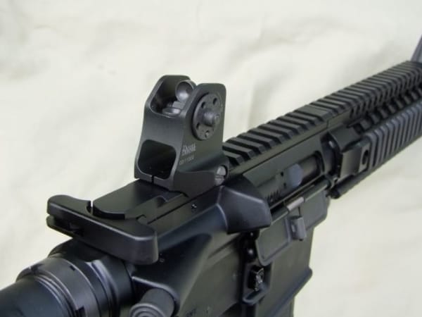 A rugged fixed, detachable backup iron sight co-witnesses with most red-dot optics. Should the sight fail, you are still ready to keep fighting with the iron sights and nothing has to be moved. If you are going to mount a magnifying optic, an ACOG, or variable power combat optic, you'll need to install a folding rear sight.