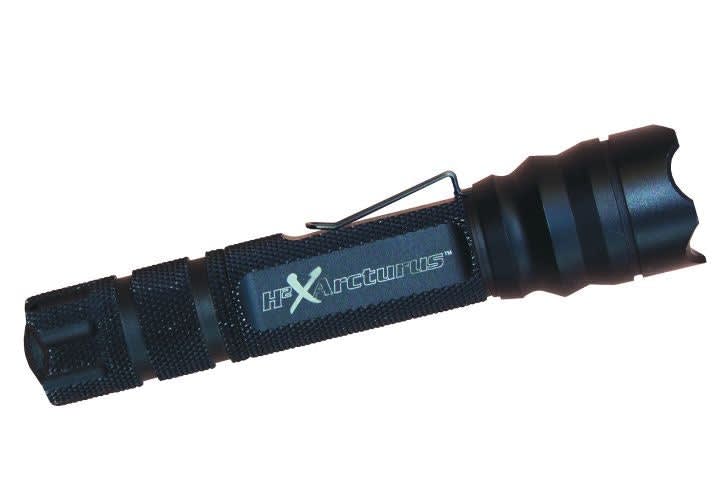 Another example of a rechargeable duty light is Insight Tech-Gear's H2X Arcturus. Its Dura-Last LEDs produce a maximum output of 150 lumens controlled by a multi-function tail cap that gives you constant, bright, strobe, or S.O.S. light modes. Built tough, the Arcturus is waterproof to 15 feet and made with lightweight aerospace anodized aluminum. Runtime is approximately three hours on a full charge. The charge will last for a full 12-hour night shift. The Arcturus is easy to use with a handgun, no matter which light technique you choose. The flat of the light mates up well with the grip of various handguns using the Rogers method. This flat gives you a nearly perfect two-handed grip-something fully round flashlights can't claim.