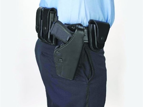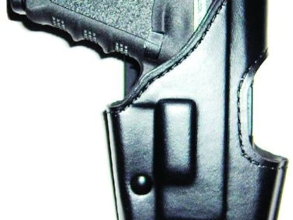 With the aid of Don Hume's new HRTL (hidden retention trigger lock) locking device, the company's Jacket Slot Style Level 2 Security holster automatically secures a gun as it's re-holstered. A retention lock enters the trigger guard so the gun will rest safe and secure. To activate simply release the low-profile thumb break and continue moving thumb downward to release the secondary trigger guard release. With a shooter's grip, simply lift the gun straight up. To re-holster, insert gun, and push down to be sure the trigger guard lock is in place, securing the gun. A thumb break snap provides extra security.