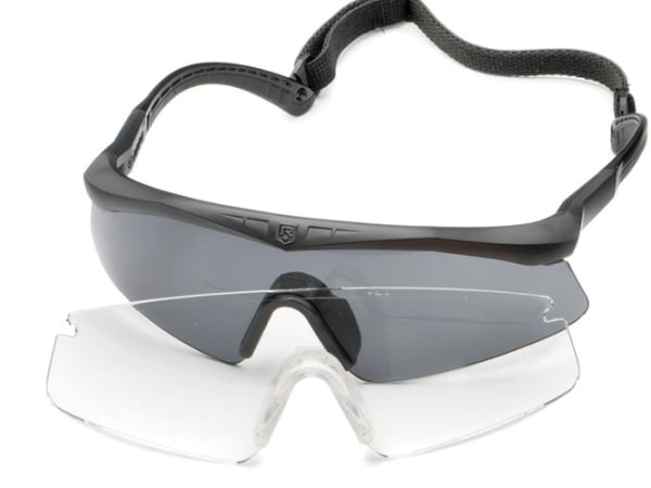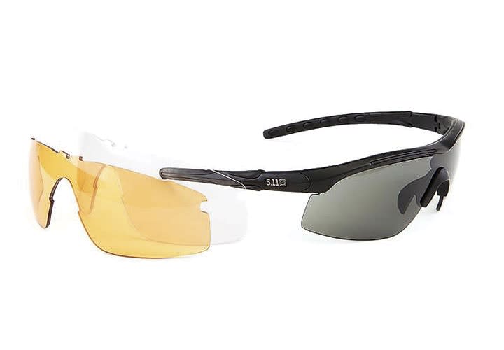 Raid Eyewear from 5.11 Tactical comes with three easy-to-change lenses in smoke, ballistic orange, and clear. Molded inserts and an adjustable and padded nosepiece give stability and a good fit. Raid eyewear is designed to provide 100-percent protection from UVA and UVB radiation and meets ANSI Z87.1-2003 protective eyewear standards. It includes a Slickstick protective case, microfiber cleaning bag, and strap.