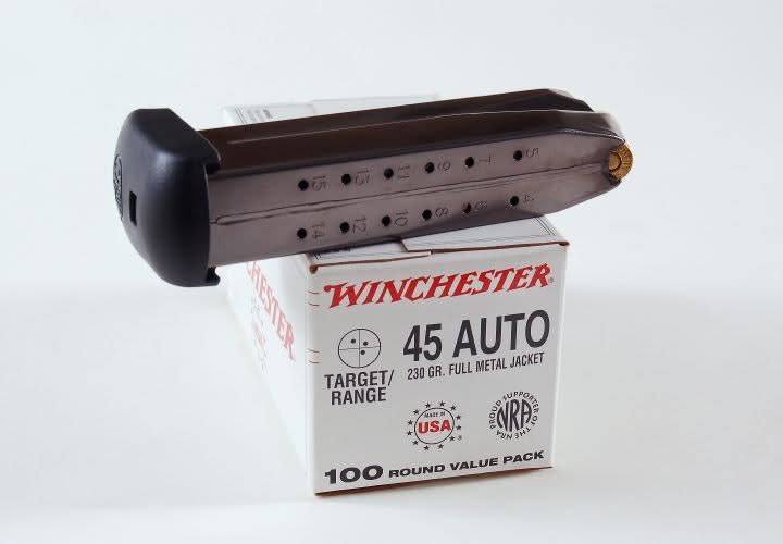 An extended magazine gives pistol operators 15+1 capacity of hard-hitting .45 ACP. Three mags arrive with the pistol.