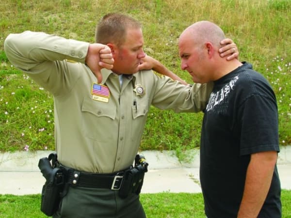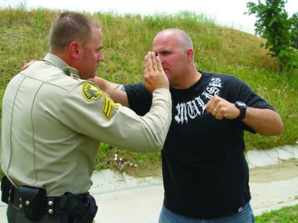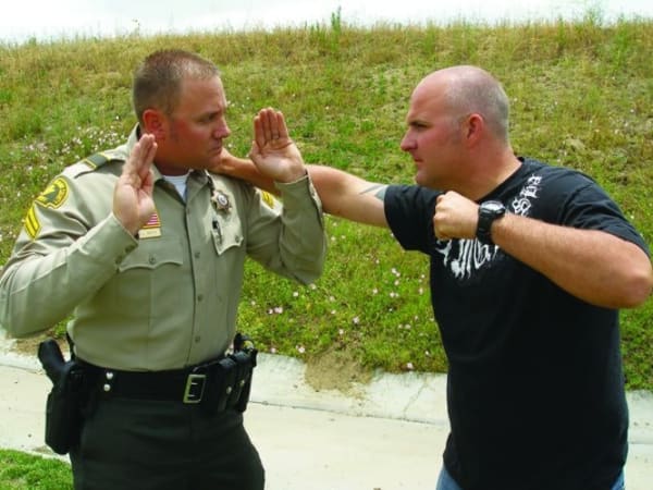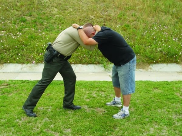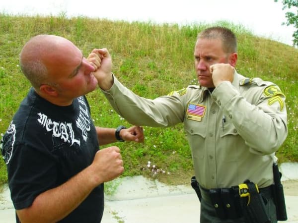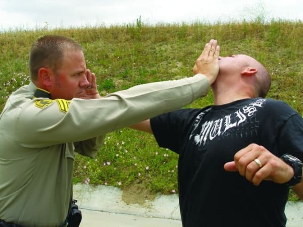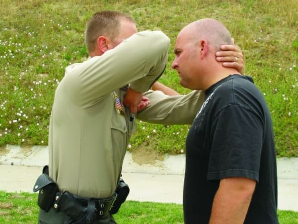 There are arguments for and against law enforcement officers using closed-hand punches. It can be better to avoid hitting a suspect with your bare knuckles so you don't injure your hands so you can't pull a trigger, hold a baton or continue striking with a broken hand. Here are four safer strikes—palm strike, bottom fist strike, knee strike and elbow strike—when dealing with a violent suspect. Our related article, " Safer Strikes ," explains how to avoid bloodborne pathogens.