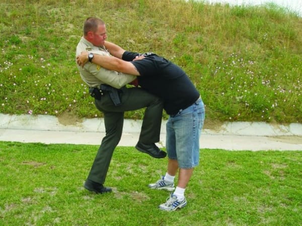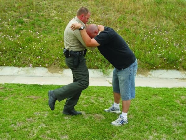 When throwing the knee strike, drive up and in to the suspect's body. While doing so, shift your weight from back to front.