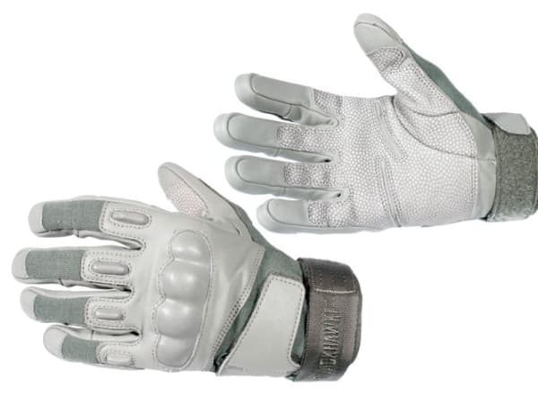 BlackHawk's new patent pending S.O.L.A.G. H.D. series expands on the S.O.L.A.G. (Special Operations Light Assault Glove) glove program. H.D. gloves provide hard-knuckle protection and a thicker cowhide leather palm and fingertips for increased protection and wear. Kevlar and Nomex versions are available: The Kevlar version protects against flame, flash, and cuts; the Nomex version protects against flame and flash. Both versions are adjustable at the wrist and back of the hand for a custom fit, and have a nylon loop on the wrist for easy donning and attaching to carabiners. Available in sizes Small to XXL.