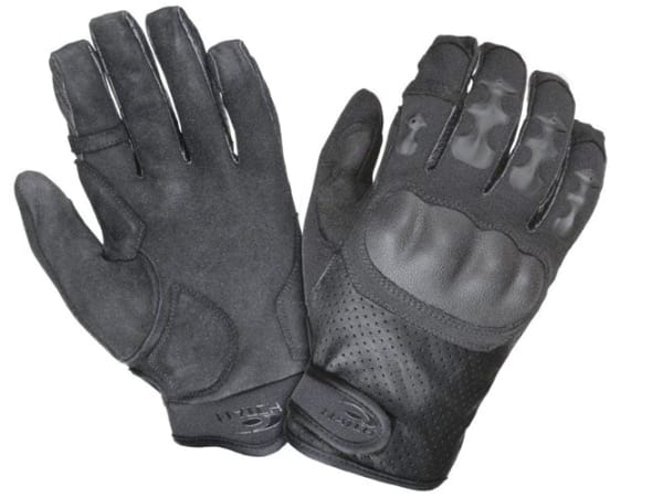 Safariland's Hatch Ultimatum tactical glove is made with molded finger guards to deflect impact with a special protective material as well as a hard knuckle guard. Polymer suede in the palm and on finger surfaces provides good grip. The Ultimatum features leather on the back of the glove with perforated ventilation for comfort. Patented Cut-Ring stitching allows for optional removal of the index finger for trigger control, and the thumb has an absorbent terry cloth brow pad to wipe away perspiration. Available in black in sizes S–XXL.