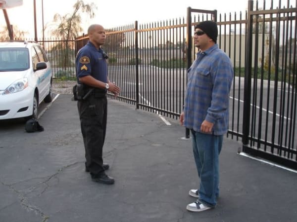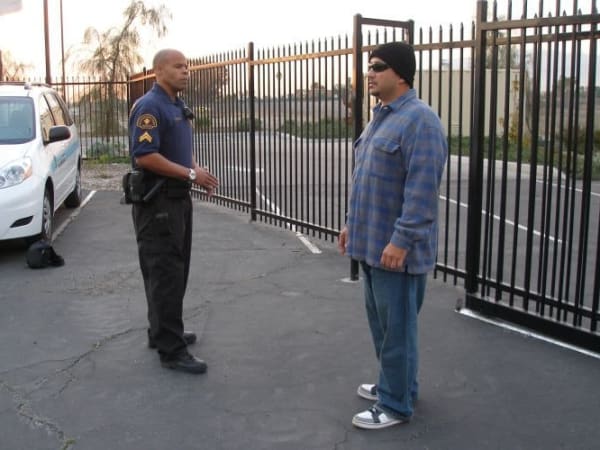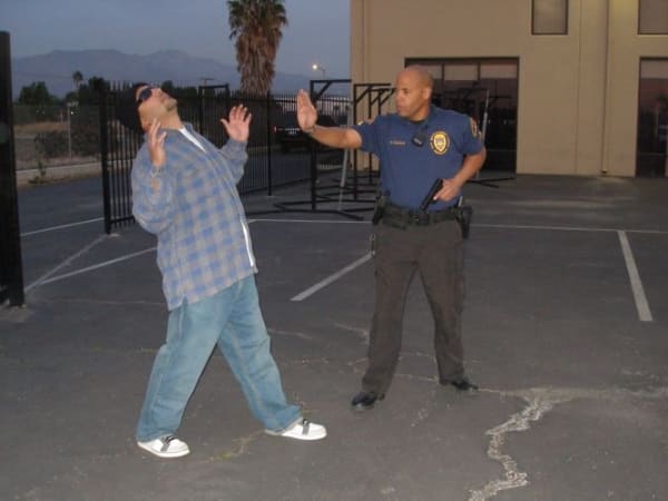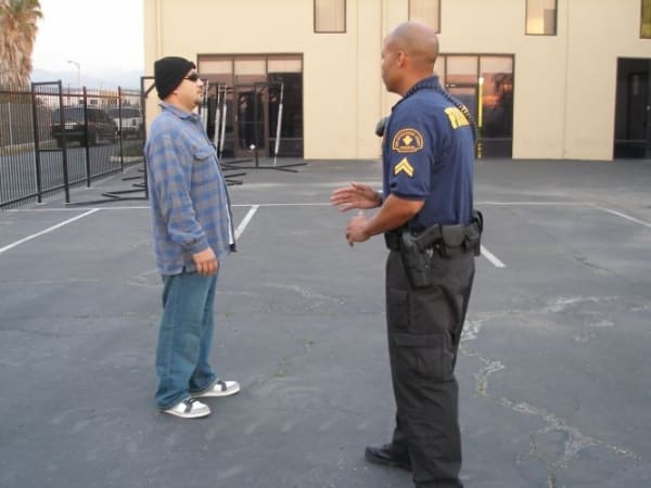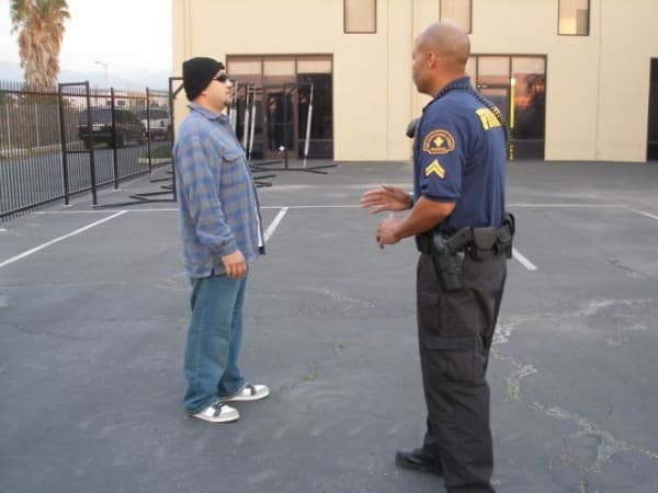 Position yourself so you're standing in the suspect's blind spot. This allows you to have a better view and quicker reaction, if he makes a move for your sidearm.