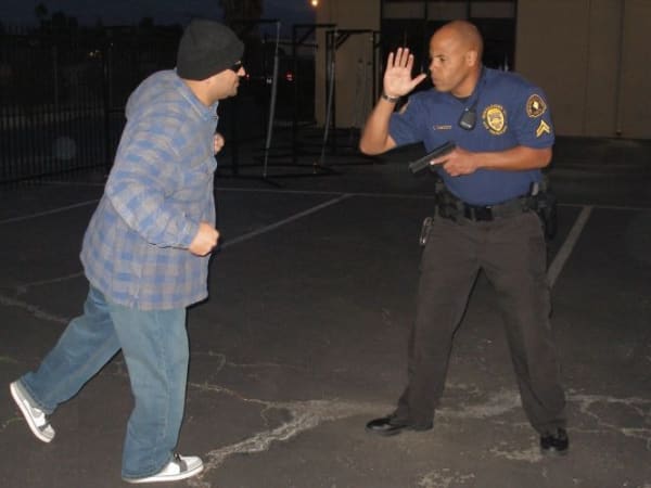 Two-Handed Approach: Remember to the concept of creating tactical distance using the gross motor skills of pushing.