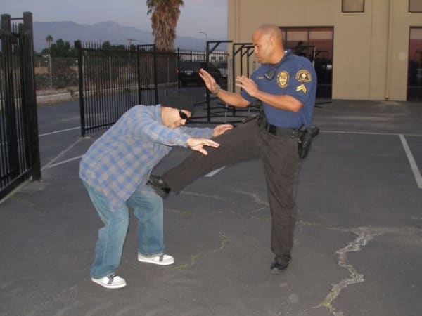 Defending With Legs: Use your leg as a front foot push. Target the suspect's pelvic region, including the lower stomach, hips, groin, quadriceps, and knees.