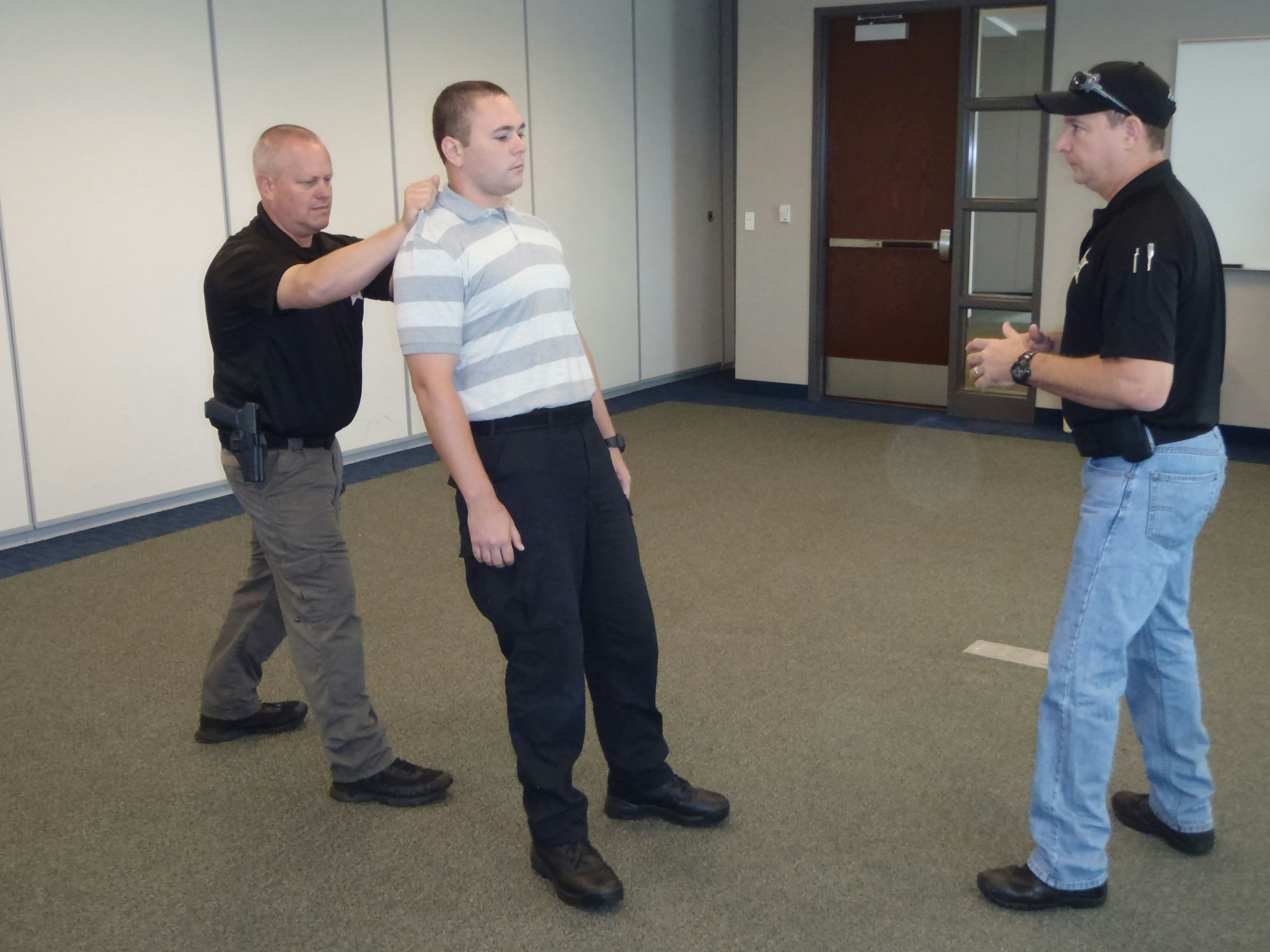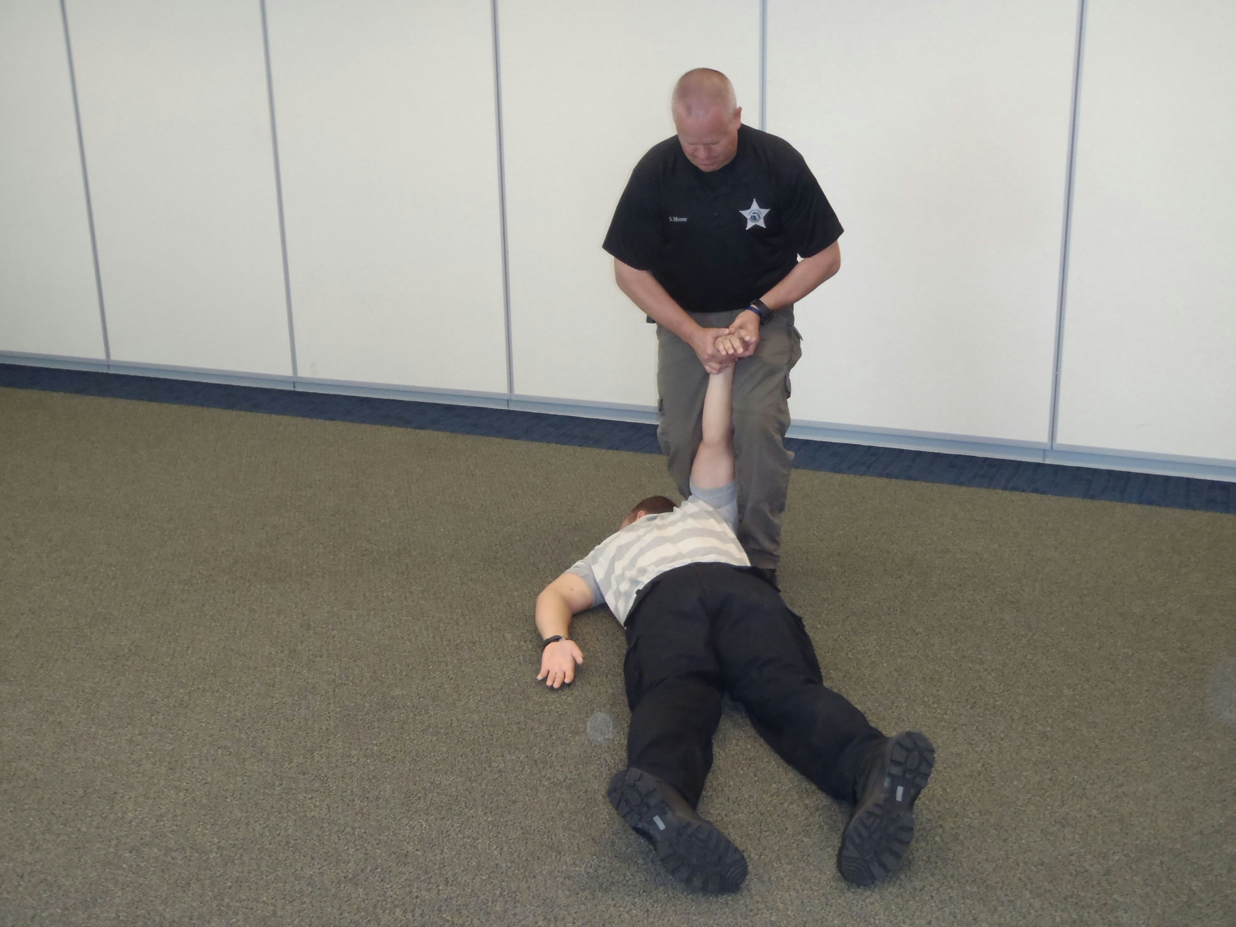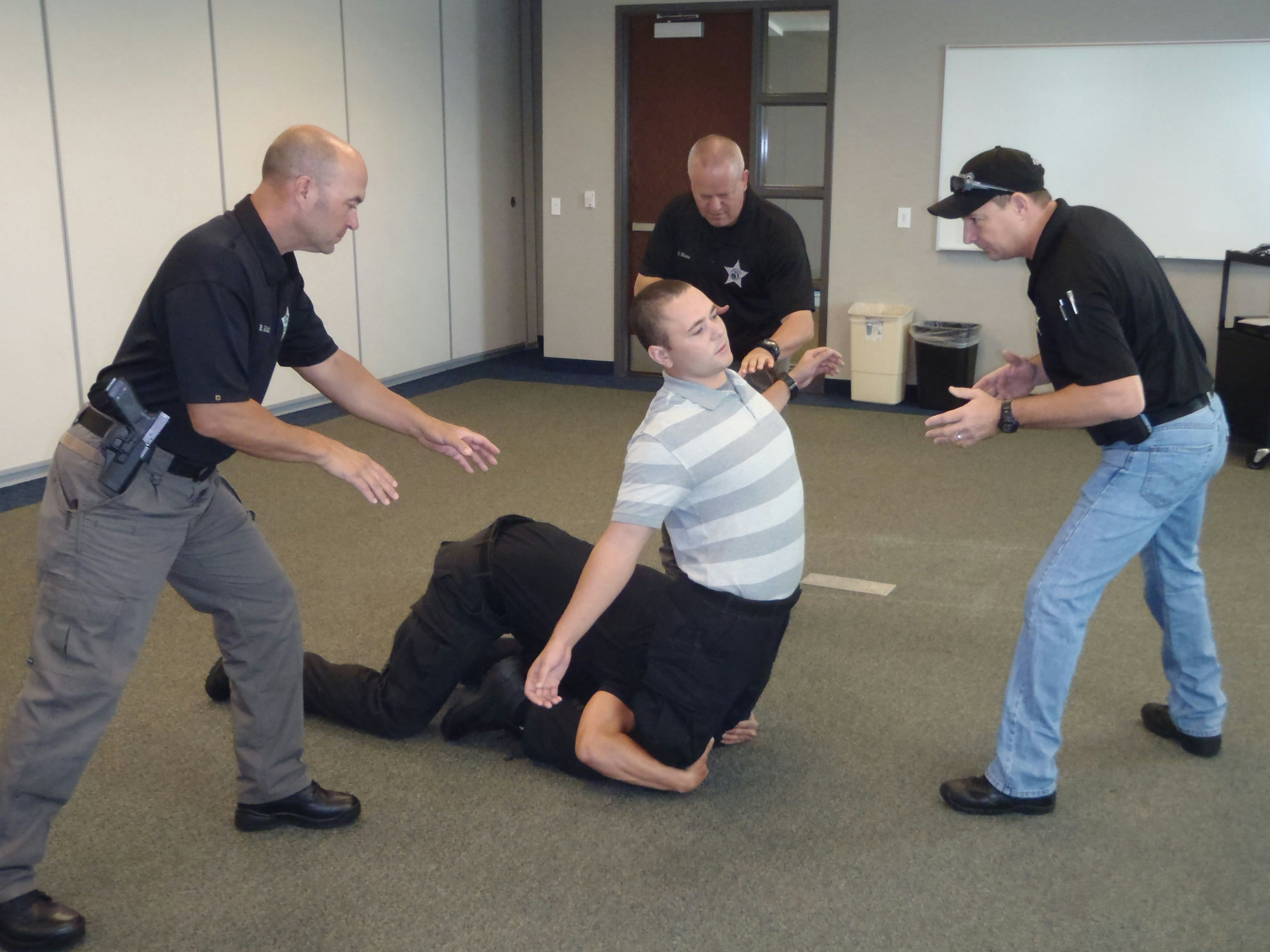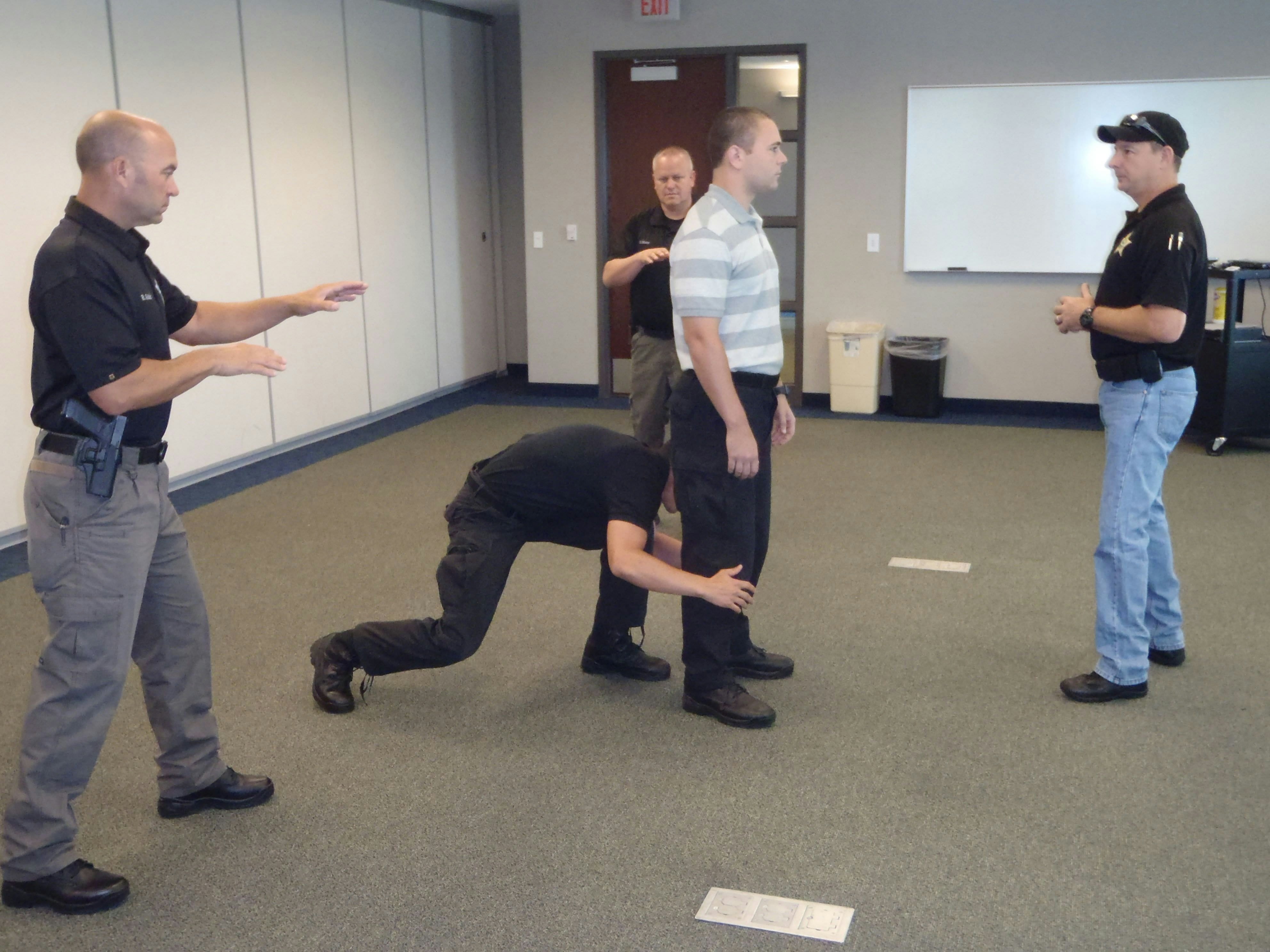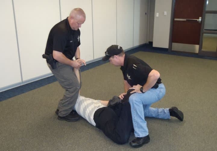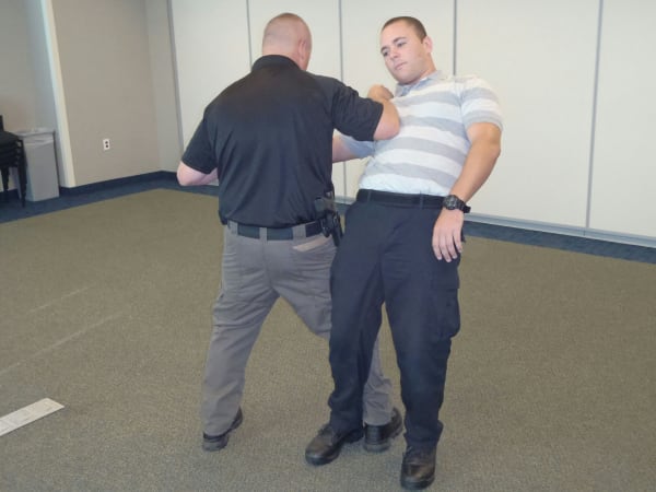 Officers on either side of the suspect set up for the rear takedown that's taught in the L.O.C.K.U.P. (Law Officers Combat Kinetics Unarmed Panoply) system.