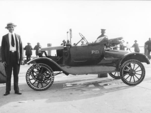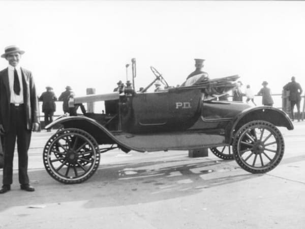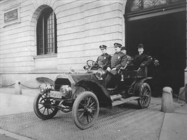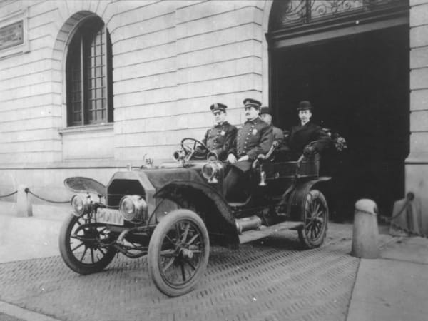 The NYPD used Ford Model Ts for its police cars in the 1910s. This photo shows a car at headquarters in 1911.