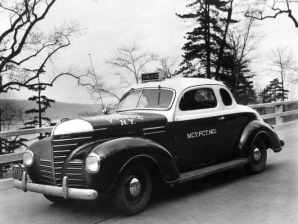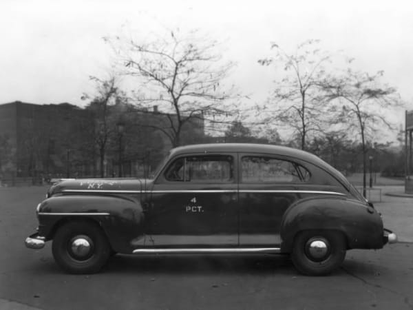 During the Second World War, NYPD officers drove two-door Plymouth radio cars without roof lights. This photo is from 1946.