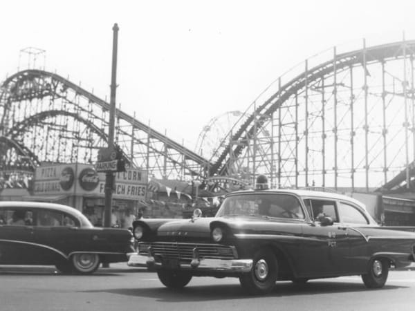 In the 1950s, the NYPD used Ford RMPs (Radio Motor Patrol). This photo shows one at Coney Island in 1956. Note the passenger-side only spotlight.