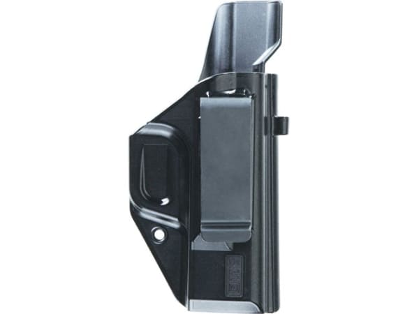 The Reflex Holster from Uncle Mike's Law Enforcement securely retains a concealed carry firearm using Integrated Retention Technology (I.R.T.), which features a retention lug on the outer wall of the holster in combination with a press arm on the body side of the holster. To release, grip and turn the mag well of the firearm toward the body. Includes a paddle attachment and pancake-style belt loop to fit belts up to 1.75 inches.