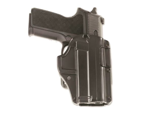 Galco Gunleather's M6X Auto Locking Holster (ALH) with Galco's patented locking device retains the pistol until the ergonomic and intuitive thumb-release lever is depressed, instantly releasing the pistol for a quick, smooth draw. This durable injection-molded thermoplastic Matrix holster fits belts from 1.25 inches to 2 inches in width. The neutral cant allows a fast and comfortable draw, while the belt slot design pulls the pistol in tight for good concealment.