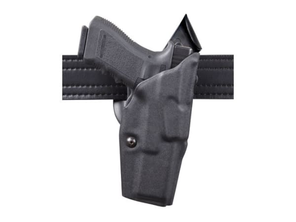 The Safariland Model 6390 ALS Level I Retention open-top duty holster can increase its security to Level II Retention with the optional Model 6006 ALS Guard and hood. This tough thermal-molded SafariLaminate holster is available for 2-inch or 2.25-inch belt slots, comes standard with the mid-ride Universal Belt Loop, and is offered in STX Tactical (all colors), STX Plain, STX Basketweave, and STX Hi Gloss finishes.