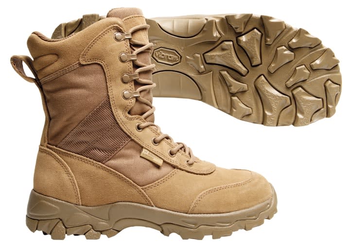 Combining lightweight, breathable, water-resistant Cordura panels, the Blackhawk Desert Ops Boots provide a hardwearing tactical boot for hot-weather environments. A moisture-wicking Dri-Lex inner lining and washable, antimicrobial, custom-molded OrthoLite foot-bed keep feet cool and comfortable during daylong training or operations. A fully gusseted tongue prevents debris from entering the boot while the Vibram outsole with large lugs gives traction on a variety of surfaces. The Desert Ops Boots feature toe reinforcements and an extra layer of suede on the heel for protection. A nylon shank has been added for additional support for operators who carry heavy loads. The boots are available in coyote tan, desert tan, and sage green.