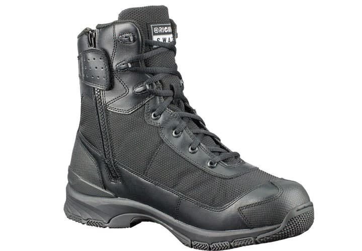 The High Agility Weight Kinetics (HAWK) 9" boots by Original S.W.A.T. are equipped with custom Flex-Lite technology as their foundation, which integrates a breathable nylon stability board. They maintain a slip-resistant traction rubber outsole that meets the ASTM F489-96 safety standard. Available in waterproof or side-zip, the HAWK boots are made with non-marking rubber, have a heel stabilizer, and are blood borne pathogen resistant. The gusseted tongue keeps dirt and debris out while the moisture-wicking lining offers Aegis antimicrobial protection. The lace hooks at the top three eyelets offer a speedy lace-up, and the brass alloy prevents rusting.
