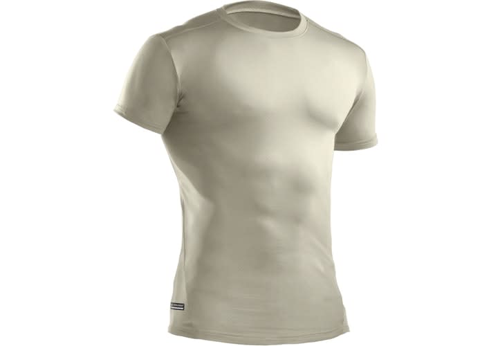 The Under Armour Tactical HeatGear Compression Short Sleeve Tactical T-Shirt has an ultratight fit to match its ultrasoft feel. Plus, strategically positioned seams reduce chafing for a truly comfortable compression experience. The Advanced Moisture Transport System in this 4.5-ounce polyester/Elastane shirt carries away perspiration so you stay cool and dry in your uniform or body armor. Lightweight, four-way stretch fabric improves range of motion and dries faster. Anti-odor technology prevents the growth of odor-causing microbes to keep your gear fresher, longer. Available in sizes small to 3XL in the colors black, marine OD green, and desert sand.