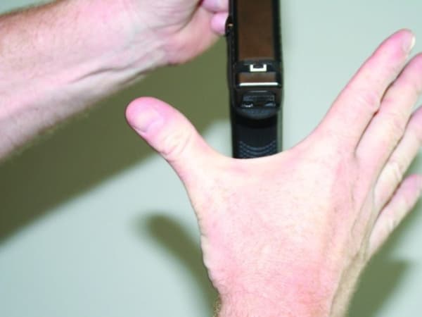 Get as much "meat" on the firearm as possible for control, epecially during rapid, multiple round firing. First, take your strong-side hand and form a V between your thumb and index finger. Take that V and place it over the grip of the firearm. Your hand should be as high up the backstrap as possible.