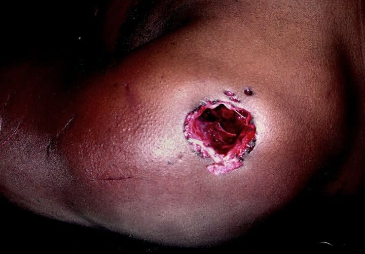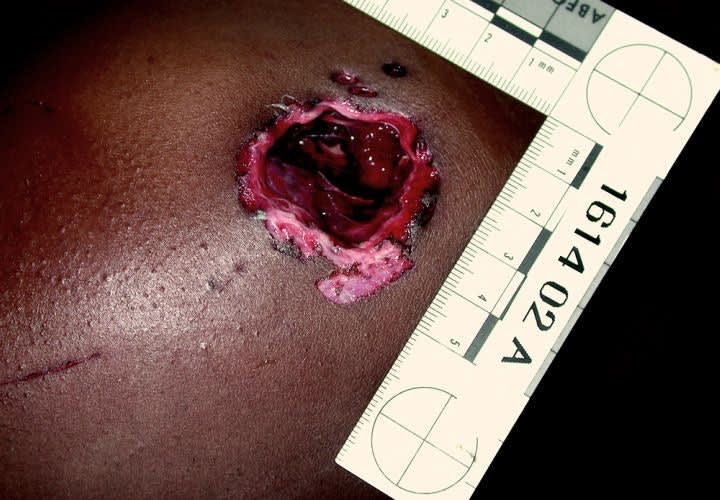 This homicide victim was shot point blank with a 12-gauge shotgun slug.