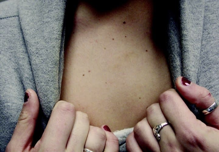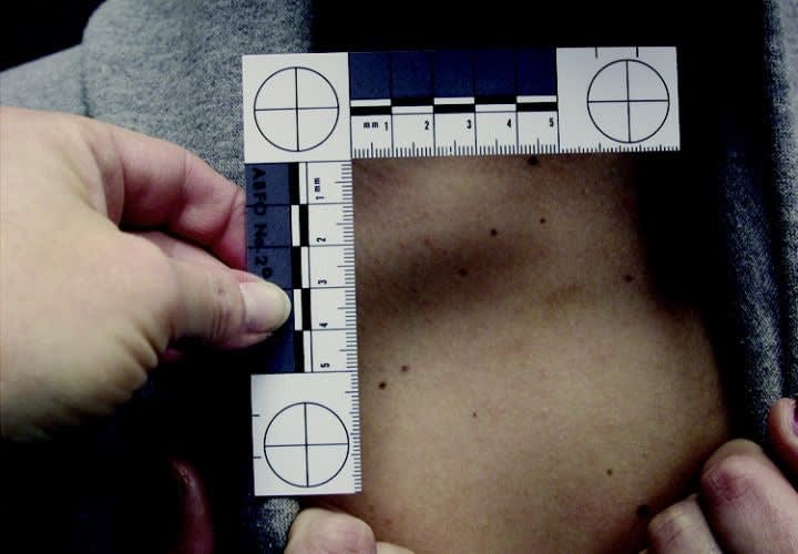The scale should be held closer to the victim's chest so that it records the size of the bruising and doesn't cast a shadow.