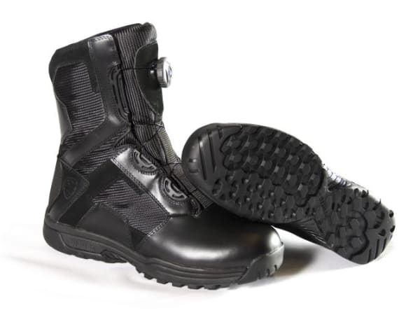 Blauer entered the law enforcement footwear market in a big way with its debut of boots defined by their snowboarding influenced “lacing” system. Instead of using traditional shoelaces and a side zipper, these boots use criss-crossed braided stainless steel cable and a dial that you pop open to release tension, and then turn to adjust the tension and close the boot. This lightweight footwear also features a hybrid tread pattern, a rounded heel for driving, and a full-grain polishable toe. It’s expected to be available in the Spring in several versions, with an insulated version following in the Fall.