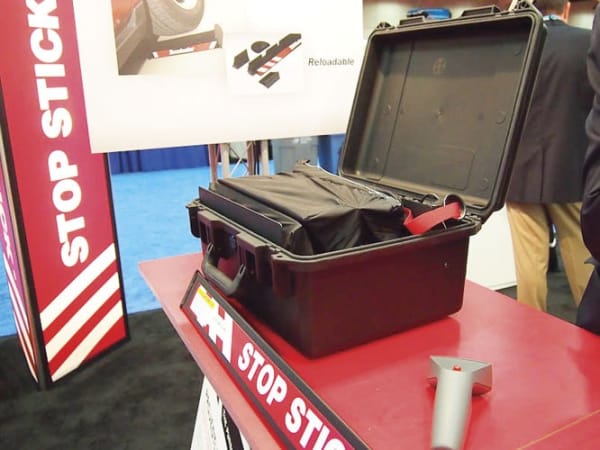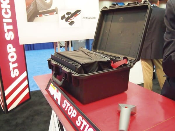 StopTech is well known for its Stop Sticks. The company's new creation, developed in partnership with Pacific Scientific, is a remote deployment kit that keeps officers safer because they never need get near the road. Instead, the officer places a 24.5-pound case loaded with a folded Stop Stick device nearby. Press the button on the remote control, and a blank launches the Stop Stick, with an attached long, heavy bean bag exiting first to pull the device across the road and straighten it out. The entire case can be carried in the trunk of a cruiser.