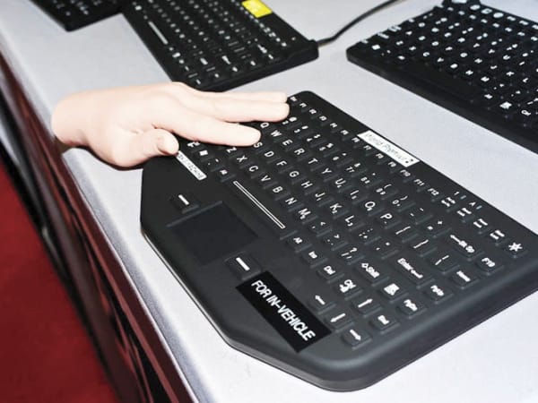 Man & Machine's rugged wipeable keyboards can be spilled on and wiped down with sanitizer because they're completely sealed. This means not only can you clean up coffee splashes and crumbs, you can also prevent the spread of germs between officers who share cars. The USB keyboards also feature adjustable back lighting, a touchpad, and silent, non-click keys. The company is working on developing a Bluetooth model.
