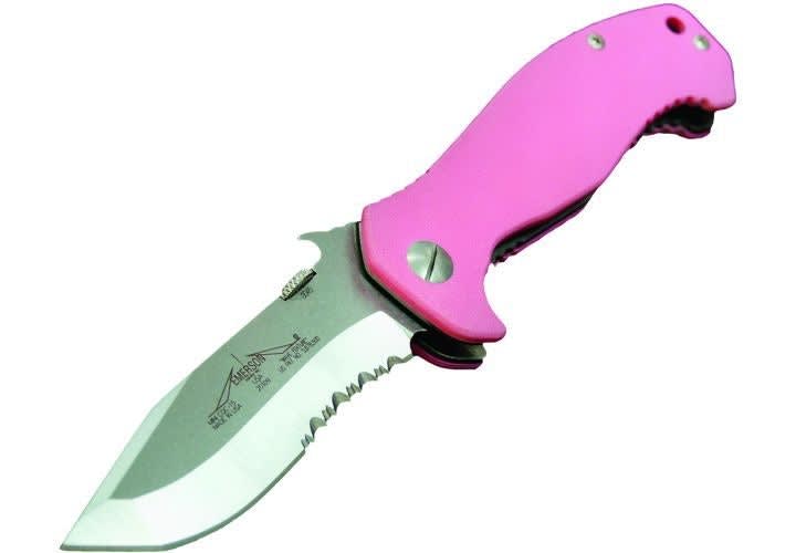 Emerson's "tactical pink" Mini C-15 SF or SFS boasts an overall length of eight inches and a blade length of 3.25 inches, which makes it the perfect size for slicing a sandwich or cutting open a bundle of suspected narcotics. The pink Mini's blade is what Emerson refers to as the Tant-Com, designed to give you the cutting power of a beveled tanto blade yet the cutting edge of a recurve blade. It can also be had in boring black.