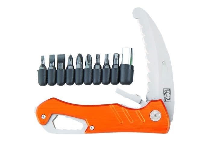 The Ka-Bar K2 Rescue is a rescue knife and screwdriver set that allows you to cut a harness or tighten down a loose screw. The knife blade is fully serrated with a blunt nose hook style, so you can slip the blade right next to the skin and not injure someone, yet quickly cut through most clothing material. So you don't lose the K2 Rescue in low light, its aluminum handle is safety orange. A nylon belt sheath that carries both the knife and driver bits keeps the K2 Rescue secure and close at hand.