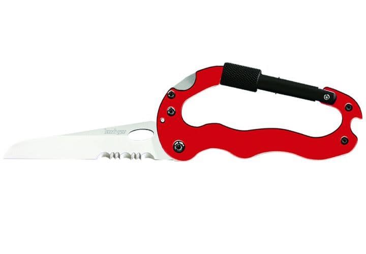 While the Kershaw Carabiner Tool should not to be used for rappelling, it will allow you to hang a heavy pack. This tool conceals a sharp partially serrated blade, both flat and Philips screwdrivers, an emergency nylon cord, and a bottle top opener. The Carabiner Tool is available in a number of colors for easy identification if you have several team members who use them.