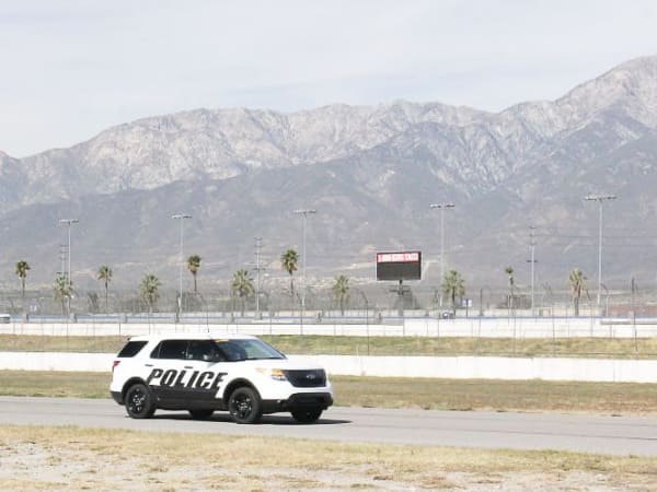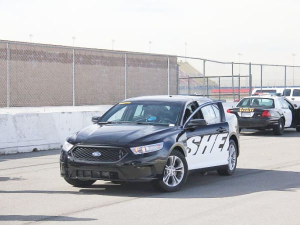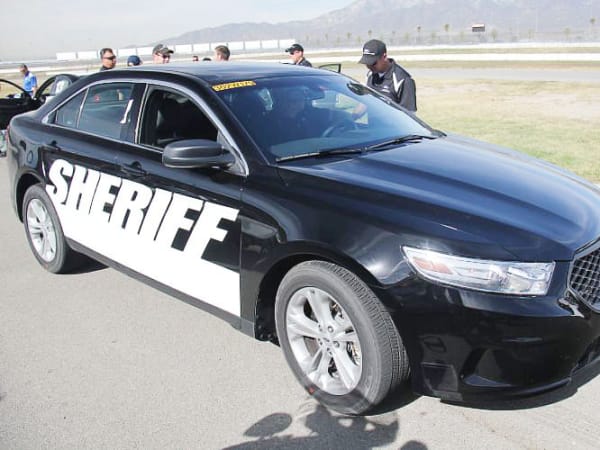 An LASD deputy rolls the Ford P.I. Utility EcoBoost toward the road course for testing.
