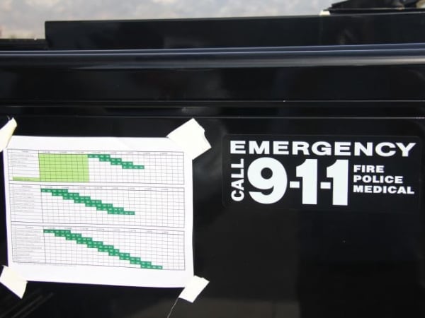 A schedule taped to a sheriff's vehicle shows the order of vehicles tested.