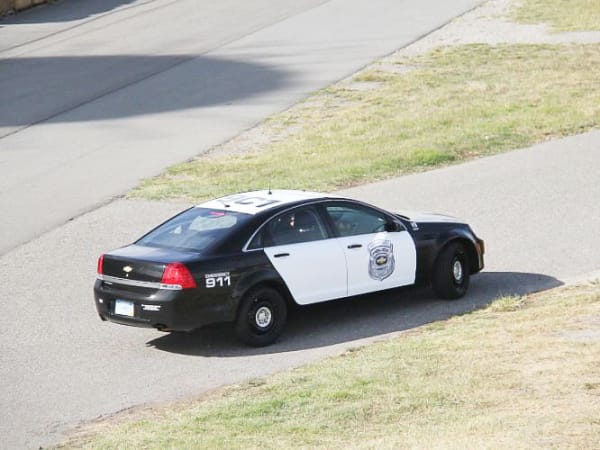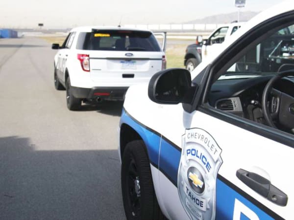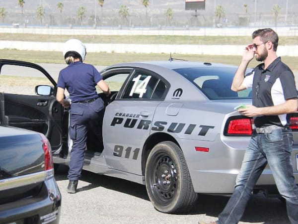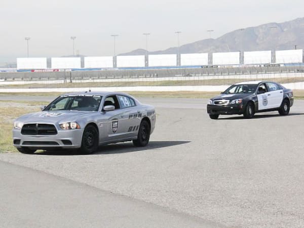 A Dodge Charger Pursuit and Chevrolet Caprice finish their test laps at the same time.