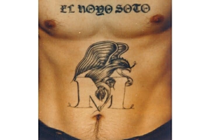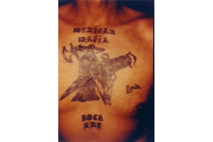 This Mexican Mafia tattoo depicts a Mexican Grim Reaper image. It is a memorial for Rocky Luna, a Mexican Mafia member who was killed by the gang for his role in the making of the movie "American Me." La Eme did not approve of the portrayal of its founder in the movie.
