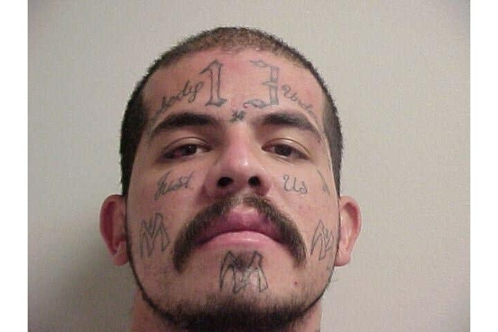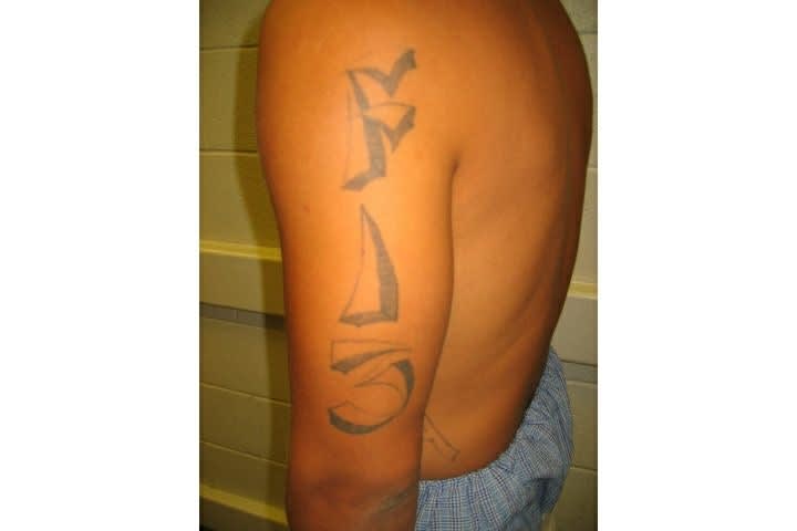 This facial tattoo displays the use of the number 13, which represents the letter "M," showing that this gang member is aligned with the Mexican Mafia.