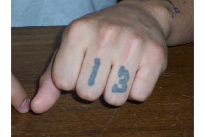 The 13 on this gang members fingers shows that he is a Sureño aligned with the Mexican Mafia. He could also be a member of La Eme affiliated gangs such as MS-13, Sur 13, and many others.