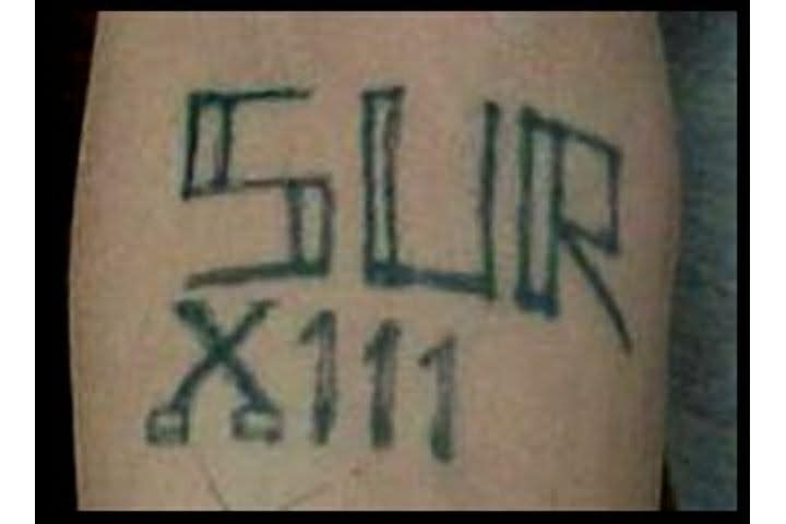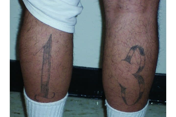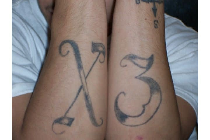 These Sureño tattoos display the use of the number 13 (in this case the Roman numeral for 10 with the Arabic number 3).