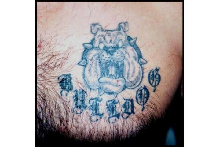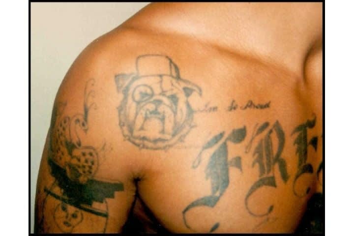 This pectoral tattoo identifies the wearer as a member of the Fresno Bulldog gang.