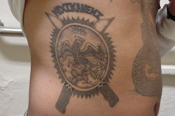 The Mexikanemi gang, represented in this tattoo, originally formed in the Texas Department of Corrections in the early-1980s. The gang’s ‘EMI’ symbol is often confused with the Mexican Mafia ‘EME’ symbolism. Mexikanemi means "Free-Mexican".
